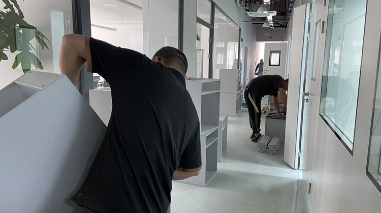 這是另外幾個安裝師傅在走廊中組裝實驗臺下體柜,鋼木柜體材質(zhì),鋼架是40*60*1.5mm的,臺面及是18mm的厚臺面。
